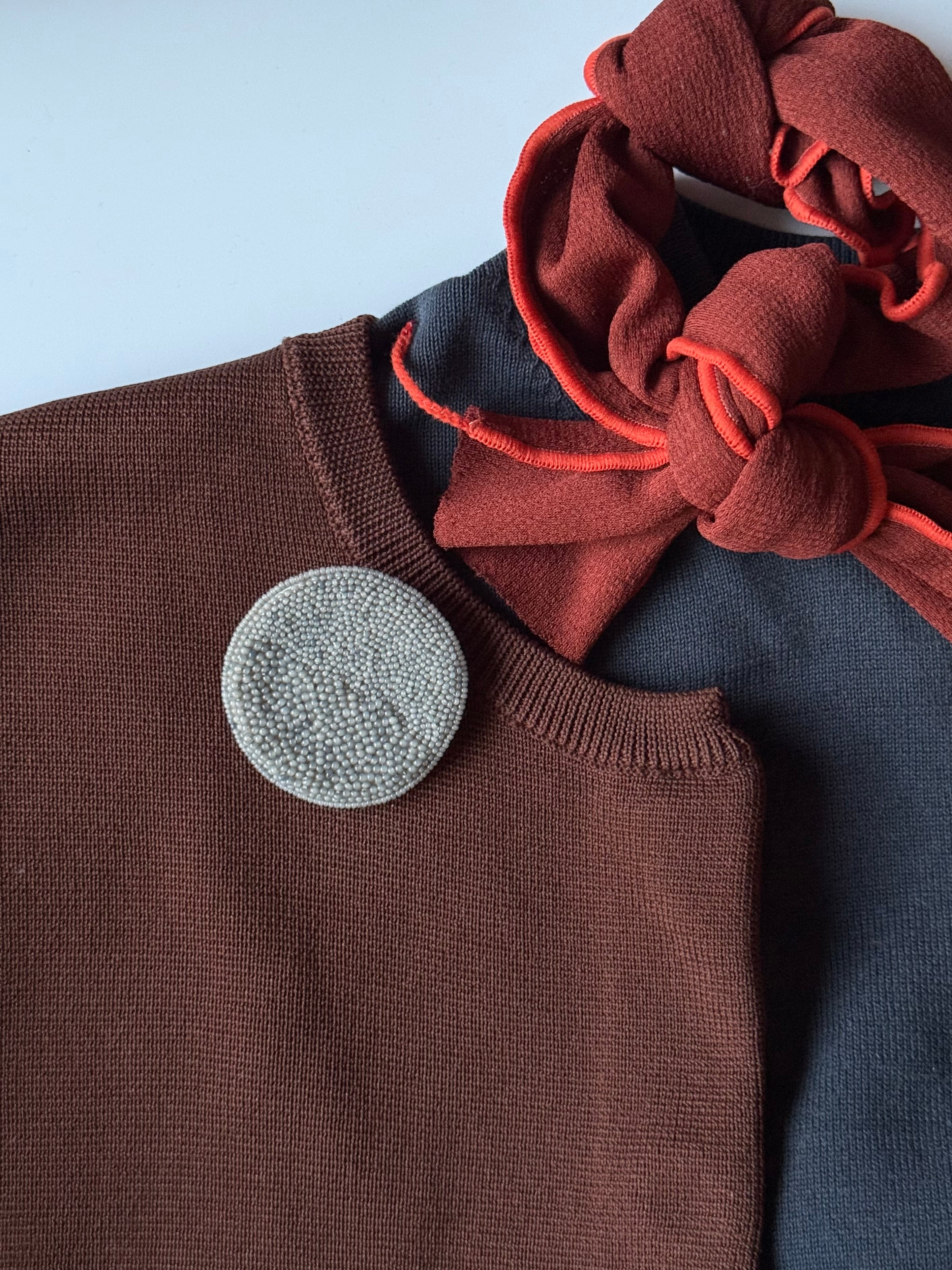 直径5cmにぎゅっとたくさんのビーズを敷き詰めたシンプルなブローチ。中央あたりでビーズのサイズを切り替えていて大小同じカラーのビーズを組み合わせることで円の中でも立体感が生まれるように仕立てています。