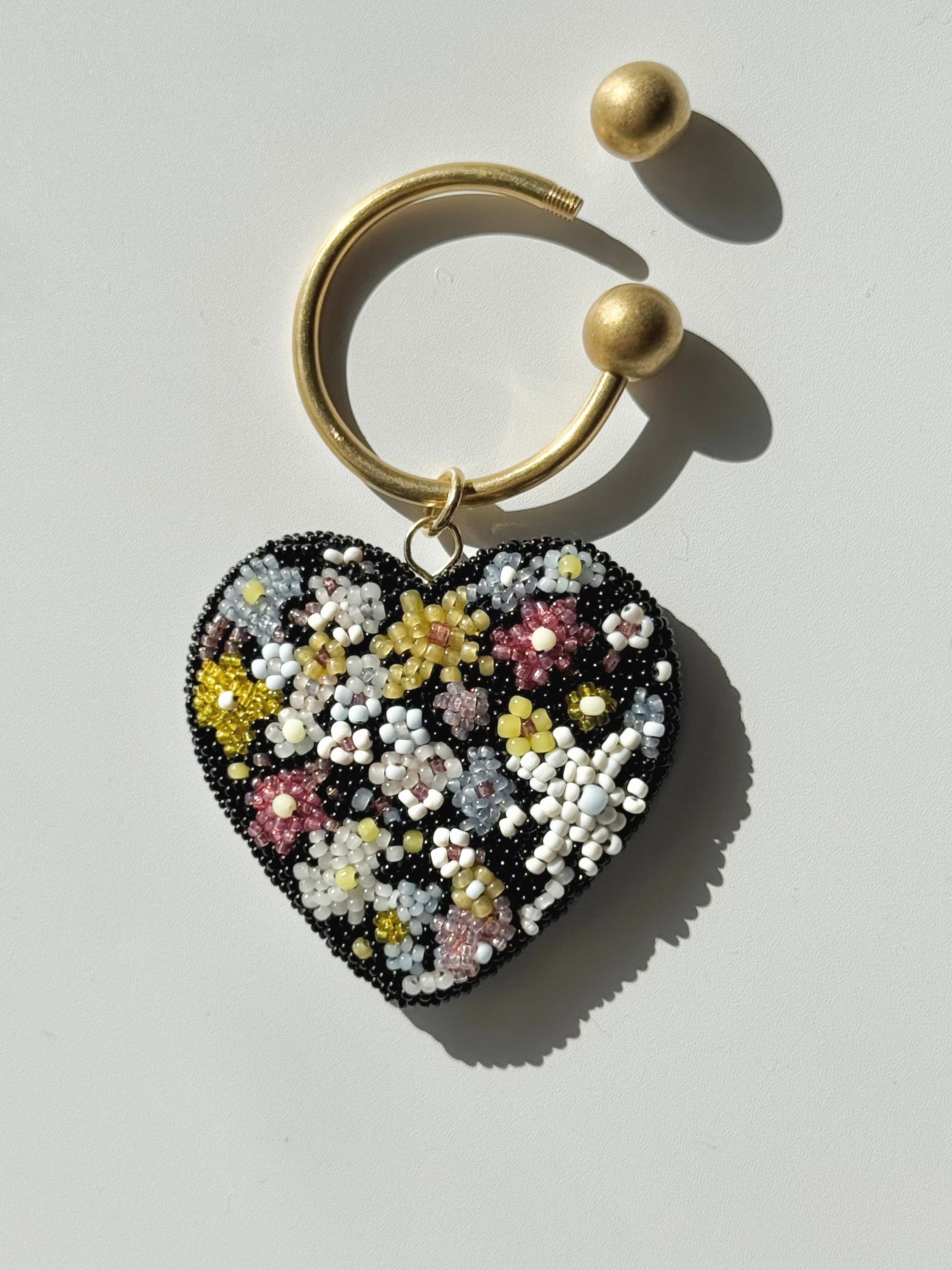 リバティプリントの愛らしい柄をそのままに、上からビーズ刺繍を施したキーリングです。