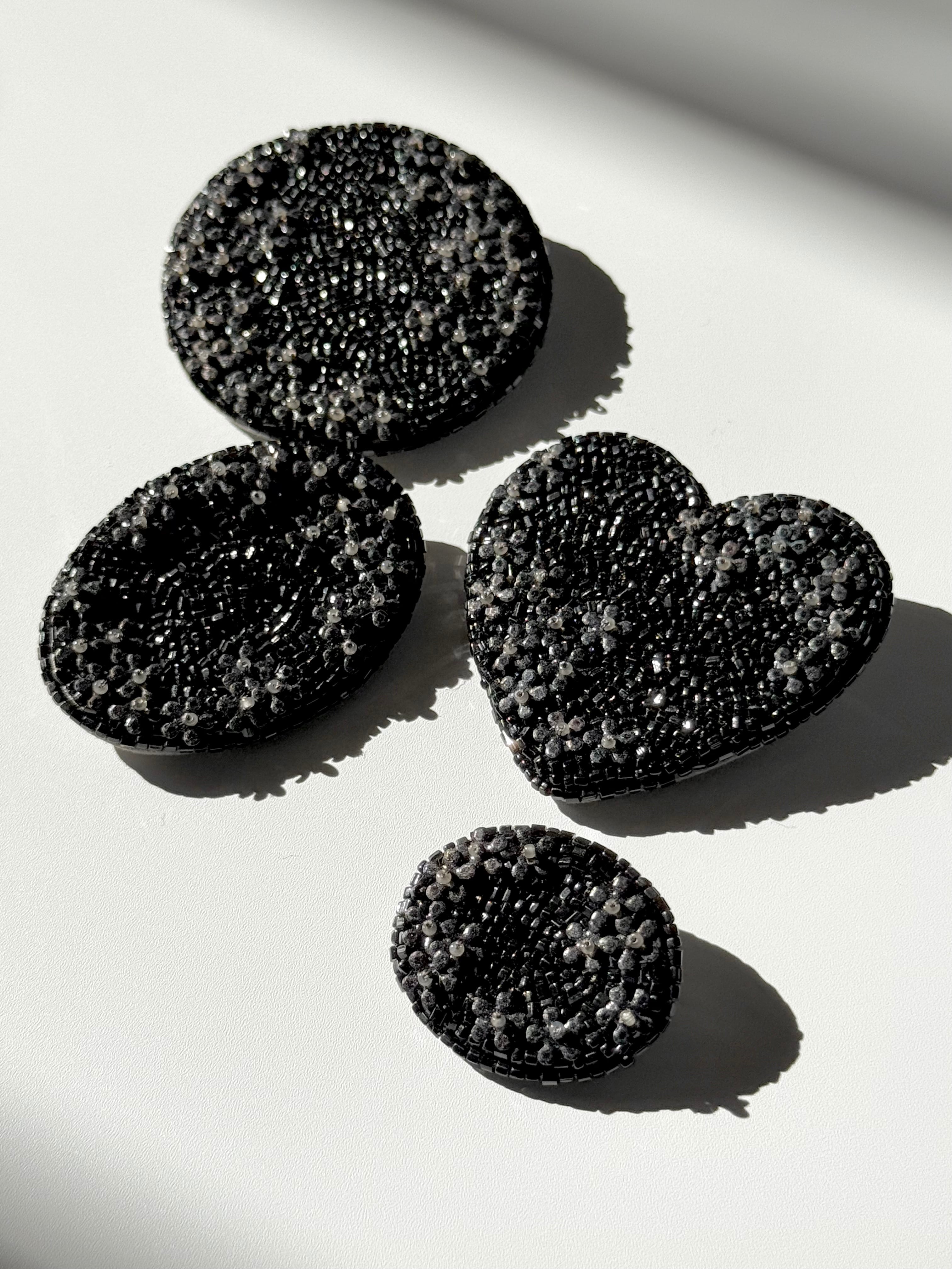 六角にカットされたアンティークのブラックビーズ1種のみを使用し大きな円を土台に刺繍していきます。平面の刺繍だけれど、六角であることや外国製の古いものならでは、質感やサイズがまちまちであることから不思議と立体的のある仕上がりです。