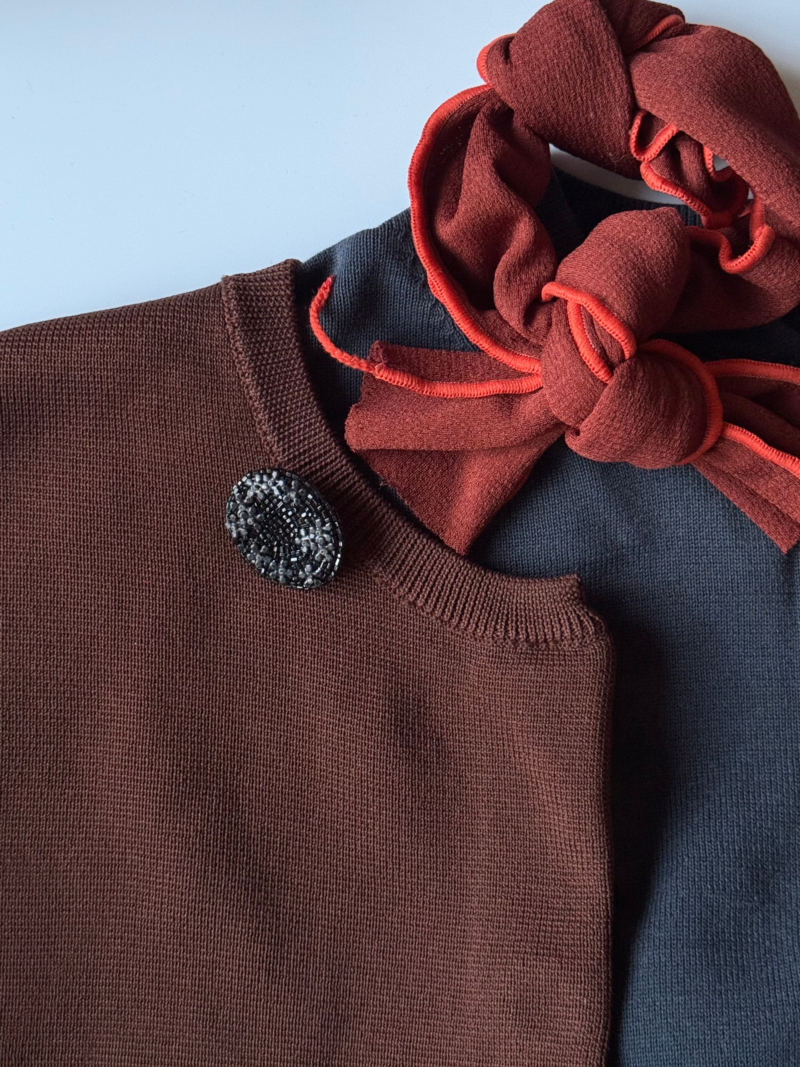アクセントとしてメタル製の大変古い花型のスパンコールをお花畑のようにランダムに散りばめました。愛らしい空気もありつつクールな雰囲気を纏ったブローチです。