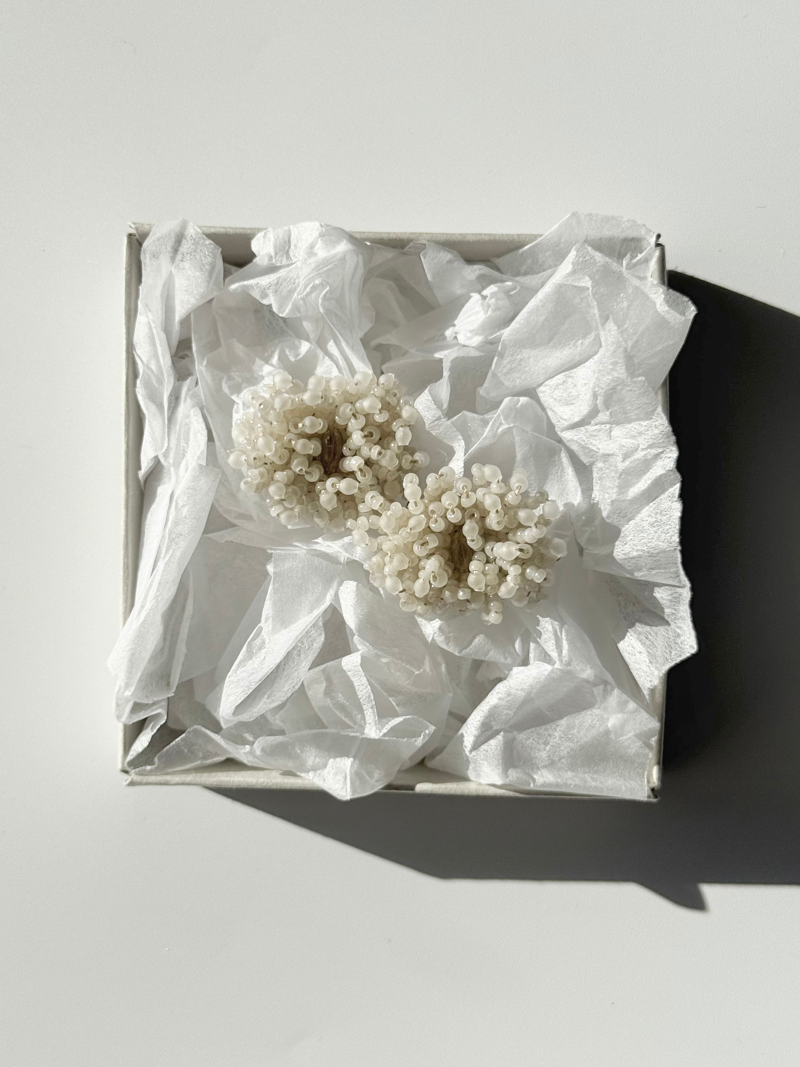 直径わずか2mmで、白というよりはうっすらクリームっぽい柔らかい色味。パールカラーの"白"に溶け込むように馴染みます。