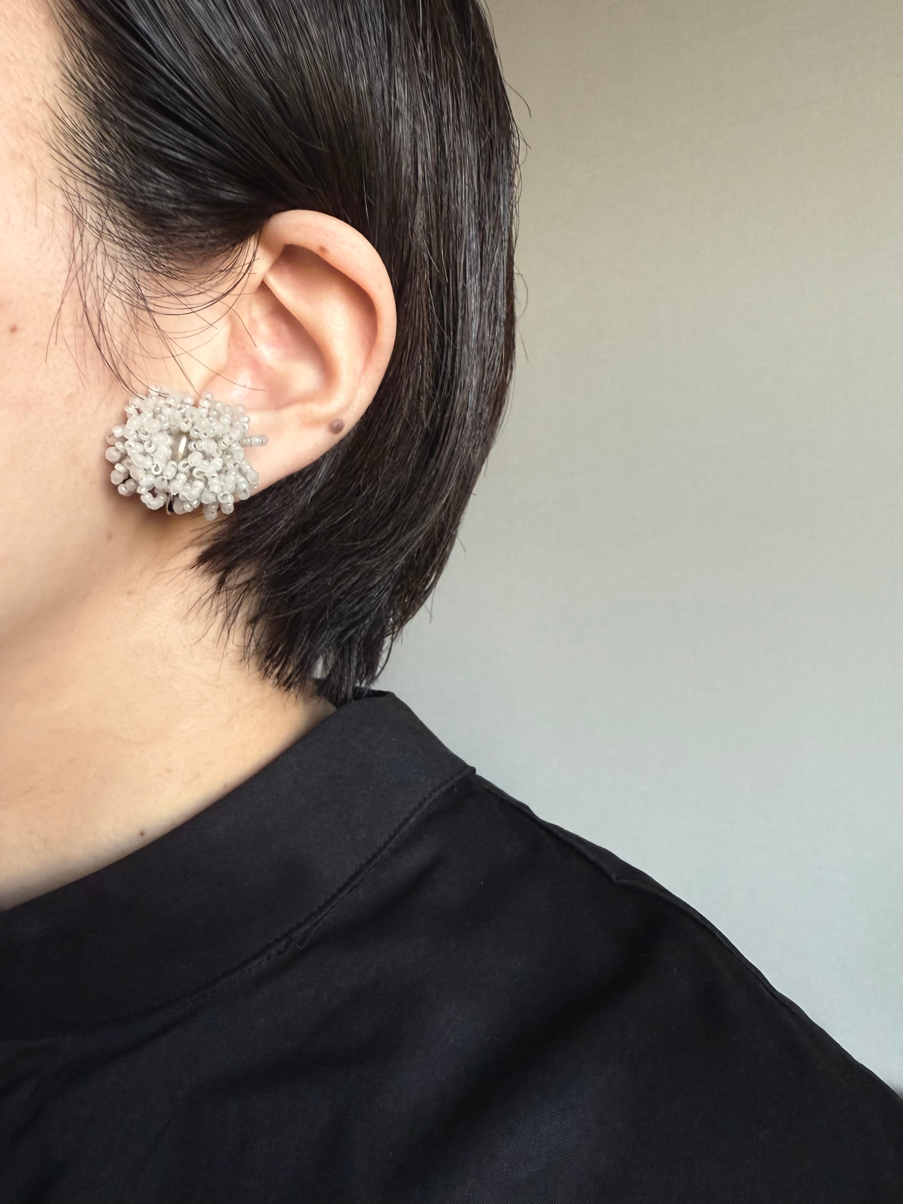 中央にチラッと見えるビーズも、クリアカラーのスフレビーズ。全部が軽やかな素材なので身に着けた時の耳への負担も少なくストレスフリーのアイテム。
