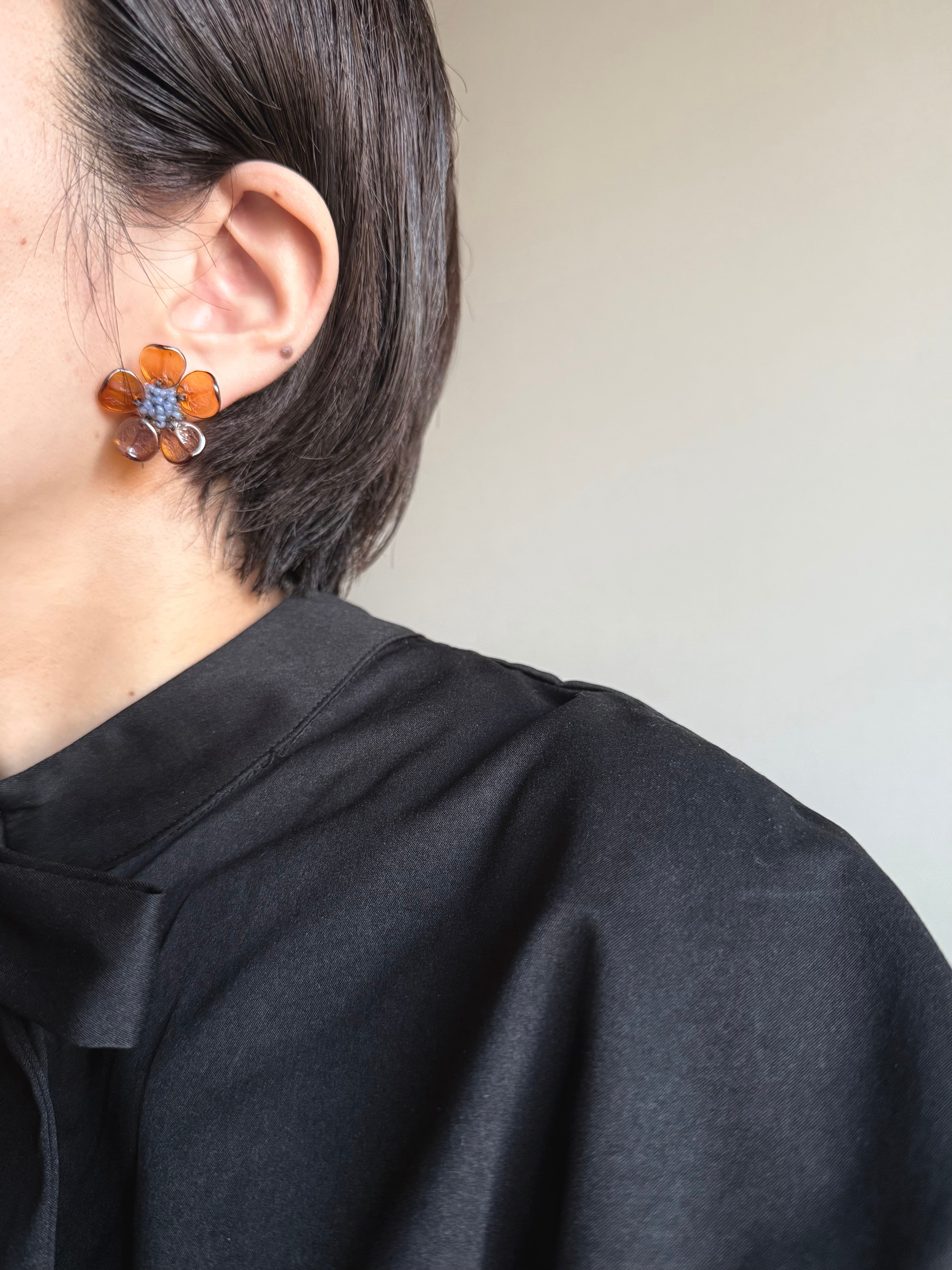 このアイテムの主役とも言える琥珀色の美しいガラスビーズはまるで初めから花びらの形のように、横から見るとかなり立体的な仕立てになっています。